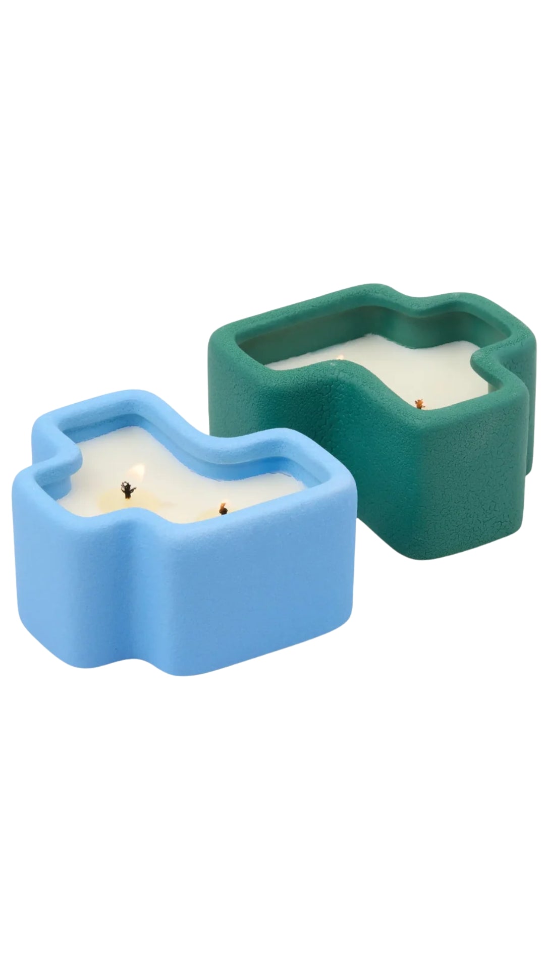 The Wild Mint & Misted Lime Jigsaw Candle set is fresh and energizing, poured into blue and green ceramic 4 oz vessels that interlock like puzzle pieces. Wild Mint offers cool herbal notes, while Misted Lime adds zesty citrus. Packaged in a gift box with magnetic closure, the vessels can be reused for storage or displayed as modern décor.
