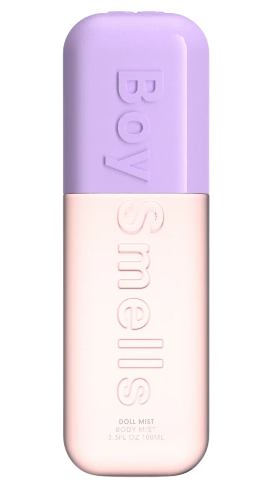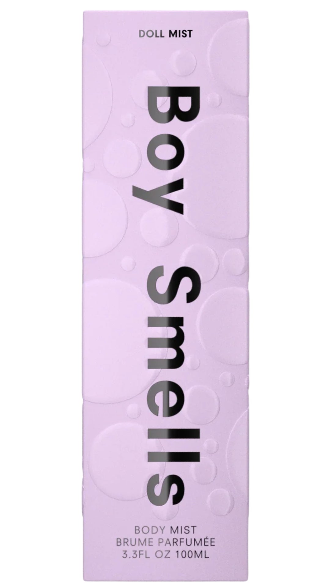 Bottle of 'Boy Smells' doll mist with a purple cap on a white background