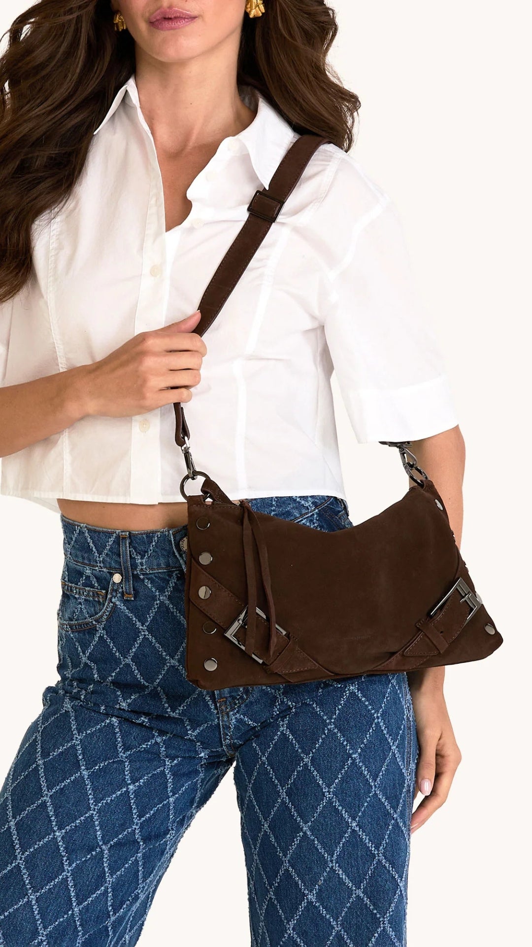 • The suede is deliciously soft - and we're here to help you keep it that way! We handpick suede that is generally water resistant. We do recommend keeping this bag away from dirt and oils - storing in its dust bag is a must! Take special caution after applying lotion, sunscreen or other skincare. We recommend washing your hands before carrying your bag!