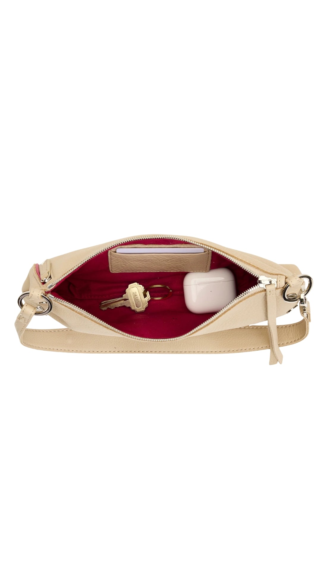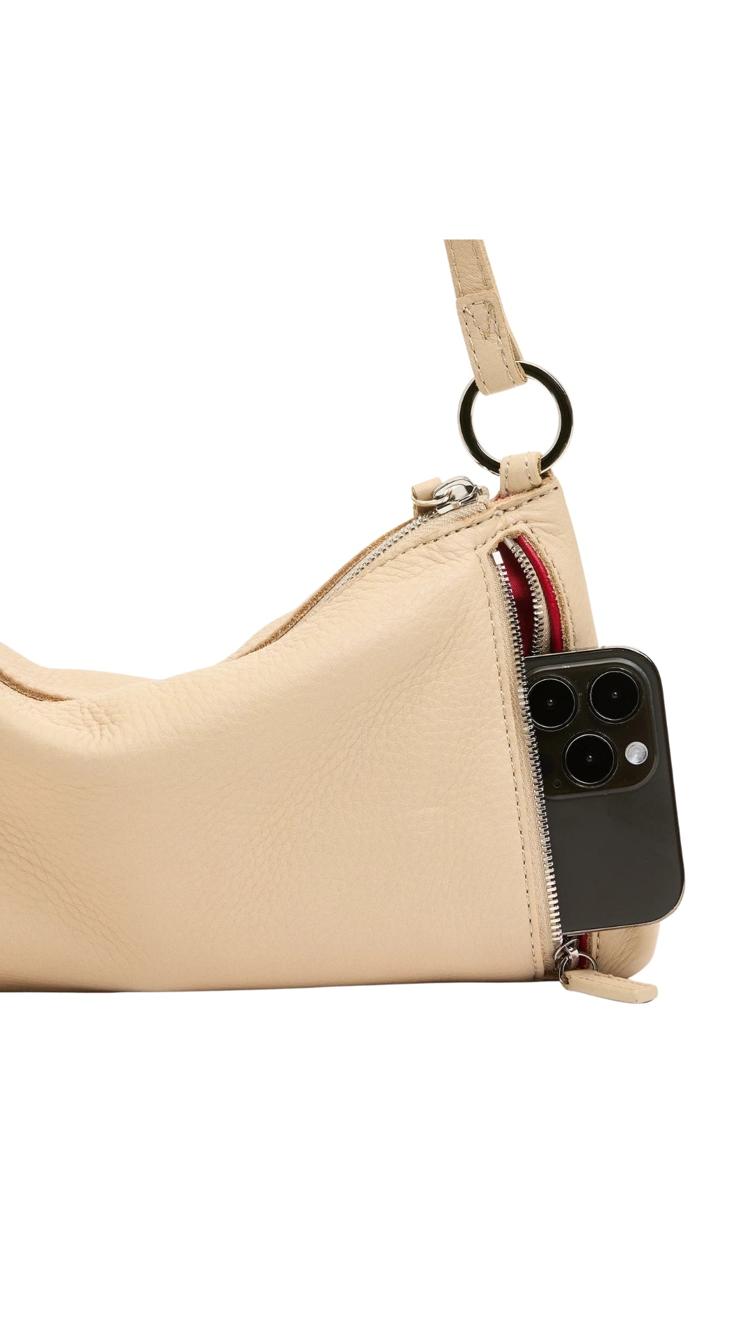 • Exterior: tassel zipper pull, o-rings for strap attachments, back zip cell pocket - vertical opening, zippered main compartment