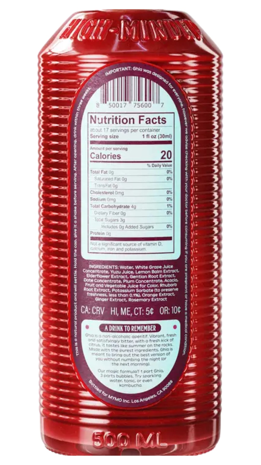 - Ingredients: Water, White Grape Juice from Concentrate, Lemon Balm Extract, Gentian Root Extract, Elderflower Extract, Date Concentrate, Lemon Juice Concentrate, Plum Juice Concentrate, Acacia, Fruit and Vegetable Juice for Color, Rhubarb Root Extract, Potassium Sorbate, Orange Extract, Ginger Extract, Yuzu Extract