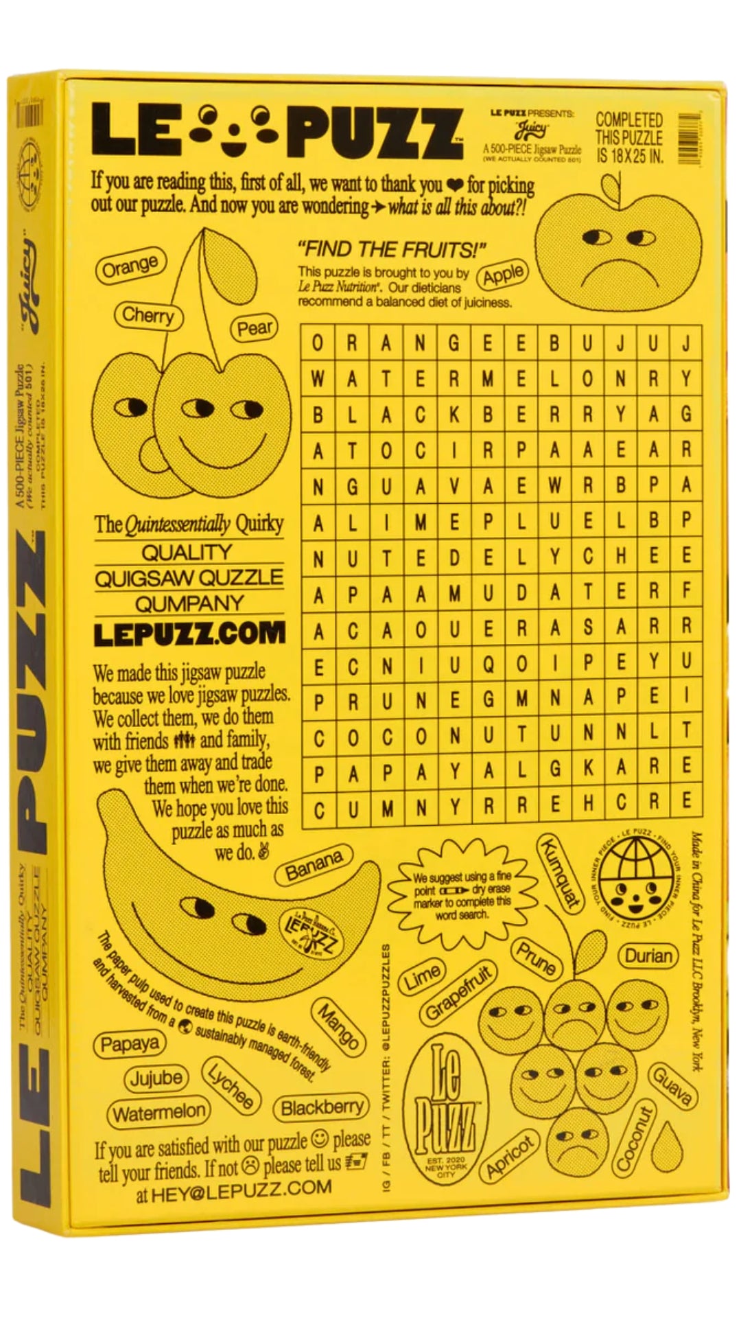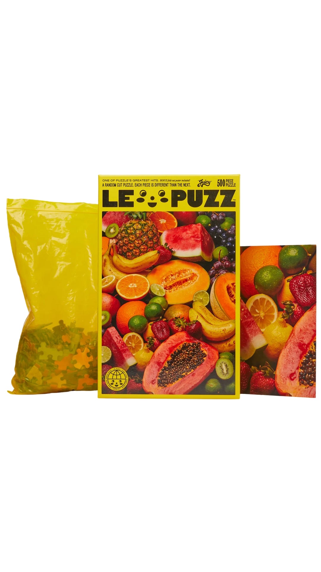 A 500-piece random cut jigsaw puzzle from Le Puzz. Juicy is our take on a classic jigsaw puzzle theme — a giant pile of fruit! You might start with the edges or dive right into sorting out the limes. Trypophobia warning this puzzle does feature strawberry and papaya seeds.