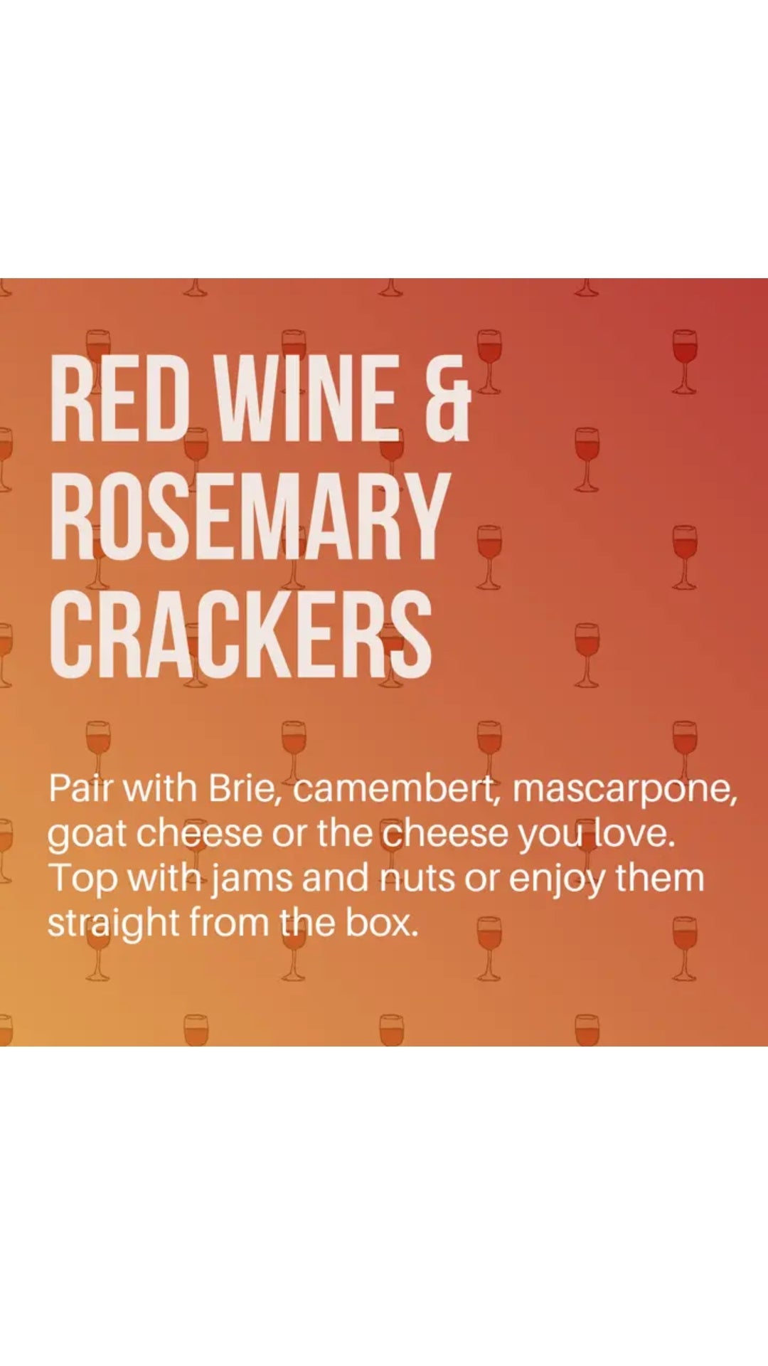 These award-winning crackers have the perfect blend of red wine essence, woodsy rosemary, and a hint of black pepper that will delight your tastebuds. Pairs with brie, camembert, mascarpone, goat cheese, or the cheese you love. Top with jams and nuts or enjoy straight from the box.