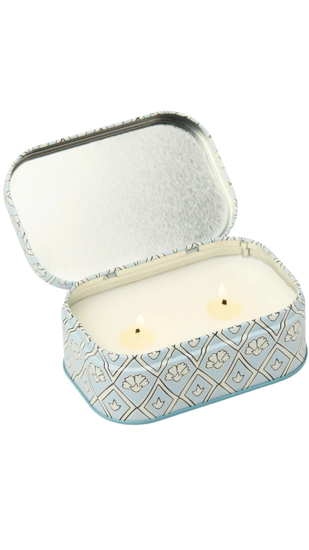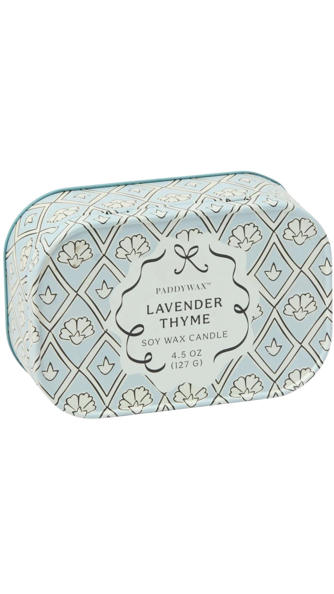The Lavender Thyme Chérie 4.5 oz Tin Candle comes in a patterned tin with two wicks, a hinged lid, and a removable label. Fragrance notes include lavender, thyme, peony, musk, and vanilla orchid. When the wax has melted away, the tin easily transitions into a jewelry or trinket box.